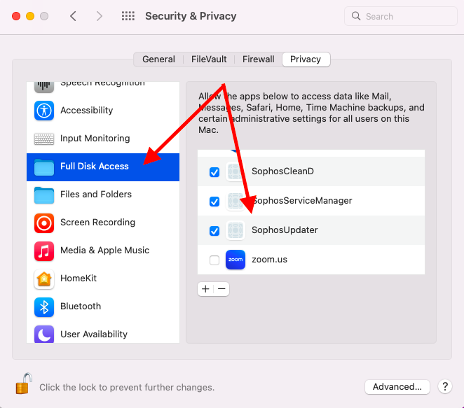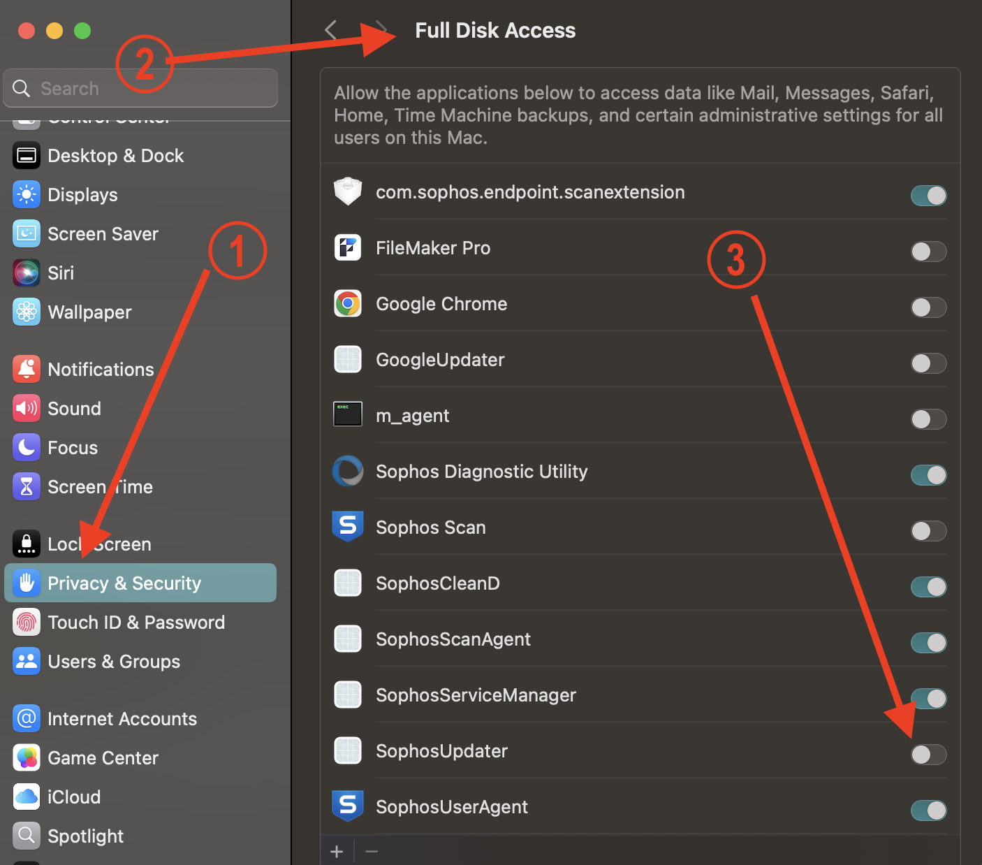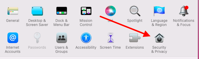 - Click on the Privacy & Security icon and click on Full Disk Access.