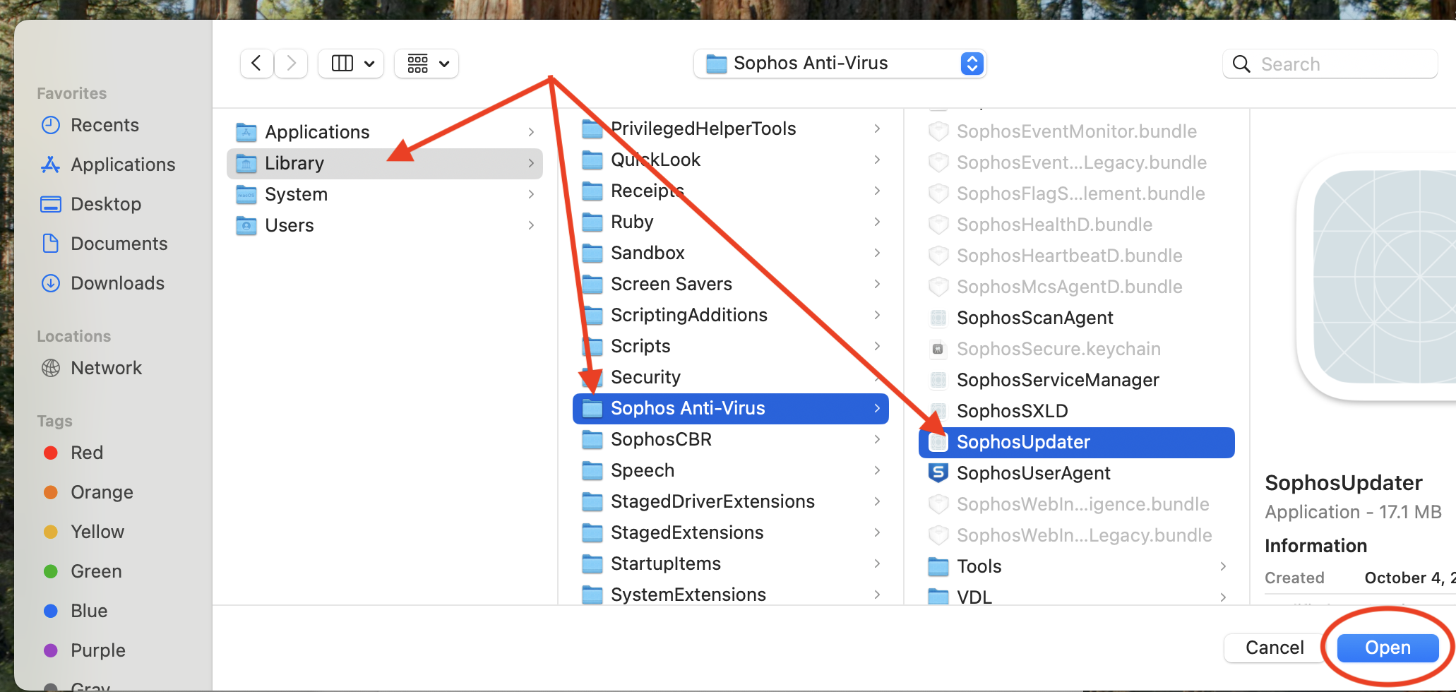 - Then click on Library > Sophos Anti Virus > Sophos Updater and then click Open