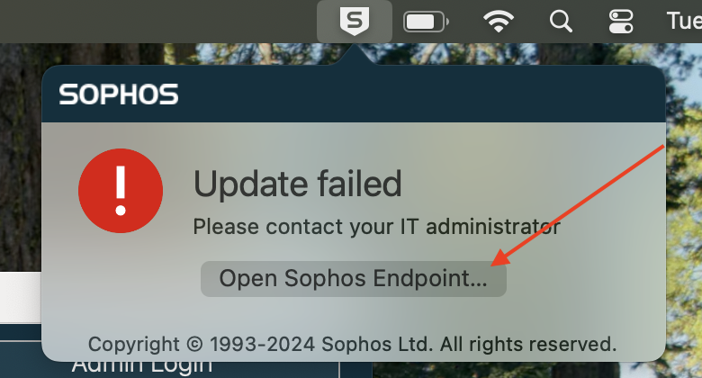 Now you are ready to Update. Click on the "S" shield on the top right toolbar (near the date & time). Click on Open Sophos Endpoint