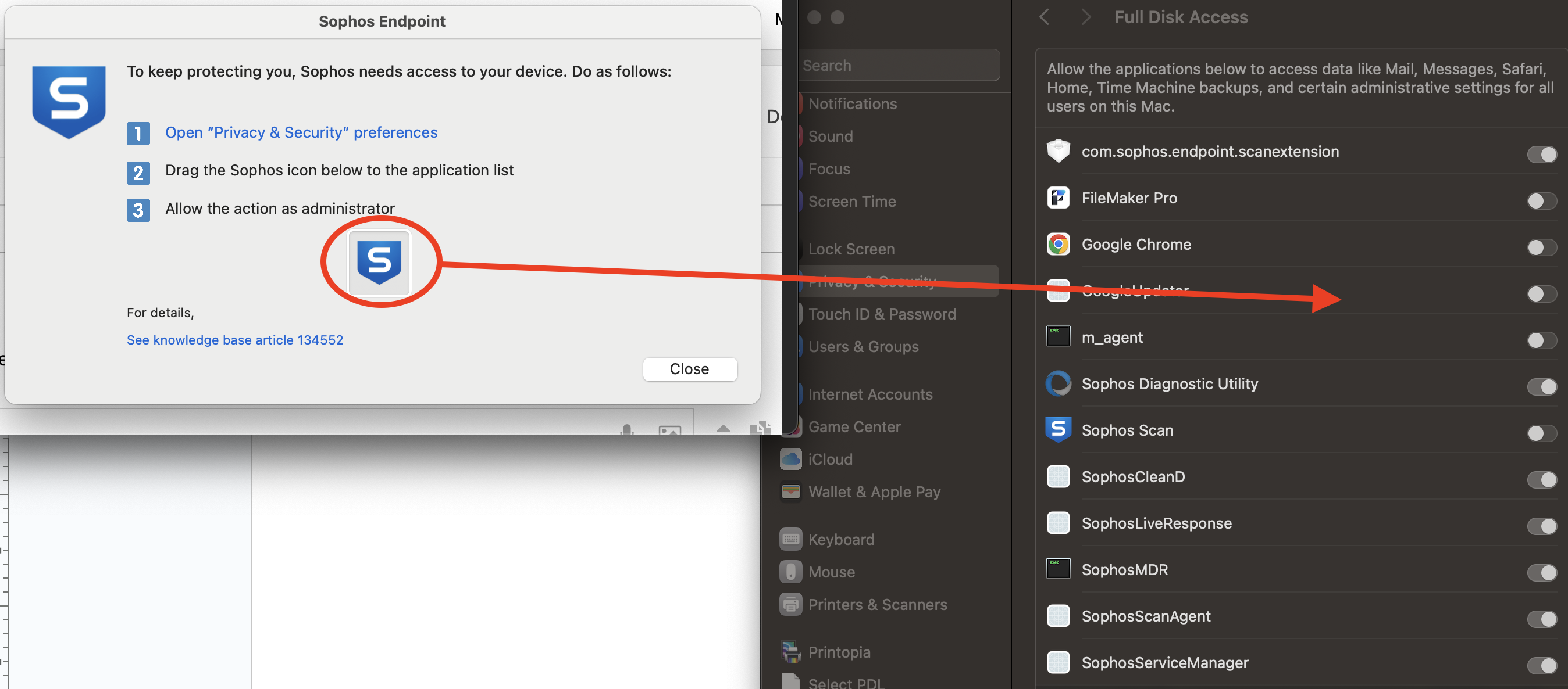 - Arrange your window so you can see both the Sophos window above and your Privacy & Security window. Click on the blue S icon (in the Sophos window) and DRAG it onto the Privacy & Security window.